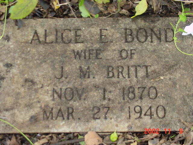 Sources: (1) A. Rozine Britt-Sheets-Bickel, Family Research Papers, File: Bk1913 Tombstone.jpg. (2) The Macon Telegraph, Obituary: Jerry M. Britt (November 10, 1943), Pg. 7. (3) Federal Census, 1860, Crawford County, Georgia, Tabor's District, Pg. 902, # 270/262. (4) Federal Census, 1870, Crawford County, Georgia, District 593; Knoxville, Pg. 437a, # 1019/1029. (5) Federal Census, 1880, Crawford County, Georgia; District 630: Webb's, # 238 at Washington Memorial Library. Page 642a, # 46/47. (6) Federal Census, 1910, Ben Hill County, Georgia; MD 1537 (Fitzgerald), Pg. 77A, # 809-735/763. (7) Federal Census, 1920, Ben Hill County, Georgia; ED 4, Pg. 11B, # 227/227. (8) Jean & Walter Ard, Cedar Ridge Cemetery List, Macon, Bibb County, Georgia (www.rootsweb.com/pub/usgenweb/ga/bibb/cemeteries/cedar.txt). (9) Jean and Walter Ard, Cedar Ridge Cemetery, 1886 - 1993; Volume 2 (Jean and Walter Ard / March 1993), Pg. 62. (10) William R. Henry, Marriage Records of Crawford County, Georgia; 1823-1899 (Published 1989). (Page numbers are for the source, not the marriage book.), Book 6. (11) Lewis Andrews Sr. (Compiled & Transcribed), Marriage Records of Crawford County, Georgia; 1823 - 1999 (http://www.usgennet.org/usa/ga/county/crawford/Marriages/marriagerecs.htm). Indexed: BRITT, Jerry to BOND, Oala C. Book 6, Pg. 196. (12) State of Georgia, Marriage Book 6 (Crawford County). Also maintained on microfilm at Washington Memorial Library, Macon, Georgia. Pg. 196. (13) A. Rozine Britt-Sheets-Bickel, Family Research Papers, File: Bk2026 Tombstone.jpg. (14) Federal Census, 1880, Crawford County, Georgia, District 573; Knoxville, Pg. 698A, # 5/5. (15) Jean and Walter Ard, Cedar Ridge Cemetery, 1886 - 1993; Volume 2 (Jean and Walter Ard / March 1993), Pg. 61. (16) A. Rozine Britt-Sheets-Bickel, Family Research Papers, File: Bk5332 Tombstone.jpg. (17) A. Rozine Britt-Sheets-Bickel, Family Research Papers, File: Bk4930 Tombstone.jpg. (18) The Macon Telegraph, Obituary: Robert H. Britt (Tuesday, October 23, 1979), Pg. 7-B. (19) The Macon Telegraph, Obituary: Robert H. Britt (Tuesday, October 23, 1979). Deaths: "In Our Area" Robert H. Britt, Macon; Harts Funeral Notices 2nd article. Pg. 7-B. Event Notes Note (1) 1860 Census, Crawford County, Georgia; June 25 & 27, 1860, Tabor's District, Pg. 901 & 902, # 270/262: Note (2) 1870 Census, Crawford County, Georgia; August 26, 1870, District 593 G.M., Page 437a, # 1019/1029: Note (3) 1880 Census, Crawford County, Georgia; June 16, 1880; District 630 (Webb's), Page 642a, # 46/47: Note (4) 1910 Census; Ben Hill County, Georgia; April 25; MD 1537 (Fitzgerald); Page 77-A, # 809-735/763: Note (5) 1920 Census; Ben Hill County, Georgia; January 17; District: ED-4; Page 11B, # 227/227: Note (6) Macon Telegraph, November 10, 1943, Page 7: Jerry M. Britt Dies After Long Illness. Jerry M. Britt, retired painter, of 1536 Third Street, died in a local hospital at 4:30 p.m., Tuesday, after a lingering illness. Mr. Britt was born in Crawford County, Dec., 26, 1858, the son of Henry N. Britt and Mrs. Elizabeth Miller-Britt and had made his home in Macon most of the time since 1889. He was in Fitzgerald, Ga., for a while. He was a member of the Bethlehem Primitive Baptist Church. Surviving are two sons. Robert Britt, Macon; Charles C. Britt, Atlanta; two grandchildren, Alice Jo Britt and Robbie Vesta Britt of Macon; four sisters, Mrs. Kitty Molton, Macon; Mrs. Mattie Wright and Mrs. O. C. Prince, Fort Valley, Mrs. Mary Revell, Fitzgerald; a number of nieces and nephews. Funeral arrangements will be announed later by Hart's mortuary. ``` Macon Telegraph, Friday, November 12, 1943; Page Unknown Funeral services for Jeremiah M. Britt, retired painter of 1536 Third Street, who died in a local hospital Tuesday evening, were held in the chapel of Hart's mortuary at 11 a.m. Thursday. Elder Yancey Hicks officiated and burial was in Cedar Ridge Cemetery. Mr. Britt made his home in Macon most the time since 1889, and was a member of the Bethlehem Primitive Baptist Church. Note: These two obituaries are also found in "Cedar Ridge Cemetery 1886 - 1993; Volume 2", Compiled and Published by: Jean and Walter Ard / March 1993. Note (7) Alice's age on the 1920 census indicates her YOB as 1877. Note (8) 1880 Census; Crawford County, Georgia; June 1; District: 573 (Knoxville); Page 698A, # 5/5: Note (9) Source: "Cedar Ridge Cemetery 1886 - 1993; Volume 2", Compiled and Published by Jean and Walter Ard / March 1993. Britt, Mrs. Alice: Mrs. Alice Britt Dies In Hospital Funeral to Be Held at Bethlehem Church on Friday. Funeral services for Mrs. Alice Britt, 123 Knott Street, who died in a local hospital at 8:15 Wednesday after an illness of four weeks, will be held at the Bethlehem Primitive Baptist Church at 10 a.m. Friday. Elder Yancey Hicks will officiate. Burial will be in Cedar Ridge Cemetery. Mrs. Britt was born at Knoxville, Ga., Nov. 1, 1870, daughter of Robert M. Lord (Bond) and Mrs. Mary A. Hortman Bond, and made her home in Macon since 1927. She was a member of the Bethlehem Primitive Baptist Church. Surviving are her husband, Jeremiah A. (M) Britt, Macon; two sons, Robert Britt, Macon; Charles C. Britt, Atlanta; two sisters, Mrs. B. Davis, Knoxville, Ga.; Miss Stella Bond, Macon; a brother, Charles B. Bond, Eufaula, Ala.; a grandaughter, Alice Britt, Macon, and several nieces and naphews (nephews). Born: Nov. 1, 1870 Died: Mar. 27, 1940. Note: Items in (parenthesis) are not included in the obituary. They represent corrections made to this record. Family History Files of Rozine Britt-Bickel Email: DonaRoze(at)aol(dot)com