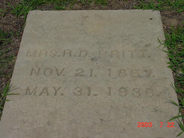 15 Mar 2009Husband: Rodessa David Britt #2881 died at age: 82 Born: 25 Aug 1871 in Georgia 1,2 Census: 1880 in Dooly County, Georgia (see note 1) Died: 4 May 1954 in Dooly County, Georgia 1 Buried: May 1954 in Pine Ridge Cemetery, Dooly County, Georgia 1,3 Father: Obediah D. Britt #1835 Mother: Sarah J. Thombley #2858 Notes