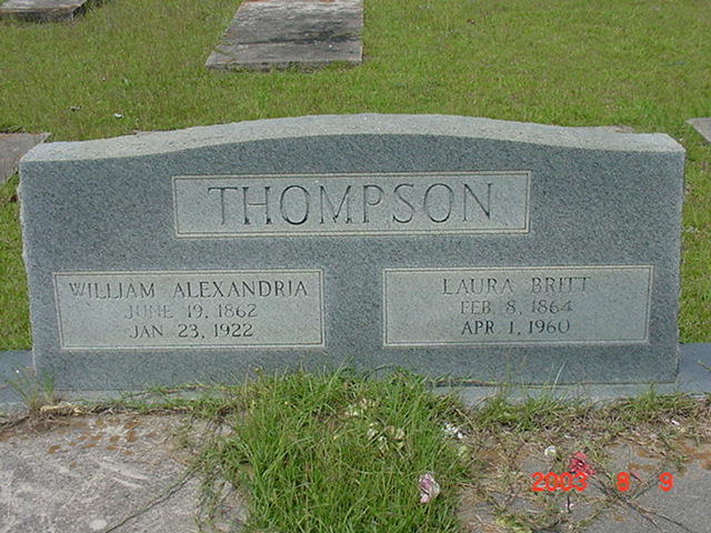 Sources: (1) A. Rozine Britt-Sheets-Bickel, Family Research Papers, File: Bk1969 Tombstone.jpg. (2) Donna C. Powell, Macedonia (B) Church Cemetery List, Grady County, Georgia (http://ftp.rootsweb.com/pub/usgenweb/ga/grady/cemeteries/macedon.txt). (3) Van Cecil Britt, Information provided during discussion with Van Cecil Britt, at his home in Fort Valley, Georgia, on November 26, 2000. (4) Federal Census, 1870, Crawford County, Georgia, District 593; Knoxville, Page 425a, # 435. (5) Federal Census, 1880, Crawford County, Georgia; District 521: Hammack's, # 238 at Washington Memorial Library. Pg. 635c; # 82. (6) Federal Census, 1900, Crawford County, Georgia; District 630: G.M. (Dent's), Part 1 # 1090, Part 2 # 1091 at Washington Memorial Library. Pg. 147A, # 119/119. (7) Lewis Andrews Sr. (Compiled & Transcribed), Marriage Records of Crawford County, Georgia; 1823 - 1999 (http://www.usgennet.org/usa/ga/county/crawford/Marriages/marriagerecs.htm). Indexed: THOMPSON, William A. to BRITT, Laura, Book C. (8) William R. Henry, Marriage Records of Crawford County, Georgia; 1823-1899 (Published 1989). (Page numbers are for the source, not the marriage book.), Indexed: Thompson, William A. to Britt, Laura; Book C. Pgs. 41, 53. (9) Submitted by James A. Rollins willows@rose.net, Grady County, Georgia; Groom Marriage List (http://www.rootsweb.com/~gagrady/GRADYGROOMS.htm), Book A, Pg. 93. Event Notes Note (1) 1870 Census, Crawford County, Georgia; 27 July 1870; District: 593 G.M.; Page 425a, # 435/443: Note (2) 1880 Census, Crawford County, Georgia; June 9, 1880; District 52, Hammack's, Pg. 635c. # 82. Note (3) 1900 Census; Crawford County, Georgia; June 7; MD: 630 (Dent's); Page 147-A, # 119/119: Family History Files of Rozine Britt-Bickel Email: DonaRoze(at)aol(dot)com