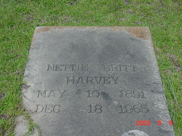 15 Mar 2009Wife: Nettie Mae Britt 1 #1982 died at age: 74 Also known as: Nettie Harvey 1,2 Born: 10 May 1891 in Crawford County, Georgia 1,2,3 Census: 14 Jun 1900 in Crawford County, Georgia 4 (see note 1) Died: 18 Dec 1965 in Grady County, Georgia 1,2 Buried: Dec 1965 in Macedonia (B) Cemetery, Grady County, Georgia 1,2 Father: John J. Britt Jr. #2438 Mother: Mary Elizabeth Davis #2584