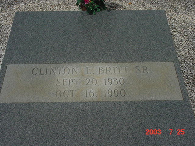 15 Mar 2009Husband: Clinton E. Britt Sr. #7756 died at age: 60 Born: 20 Sep 1930 in 1 Died: 16 Oct 1990 in Ashburn, Turner County, Georgia 1 Buried: Oct 1990 in Rose Hill Cemetery, Ashburn, Turner County, Georgia 1 Father: Charlie O. Britt #4730 Mother: Katie Irene Davis #4731